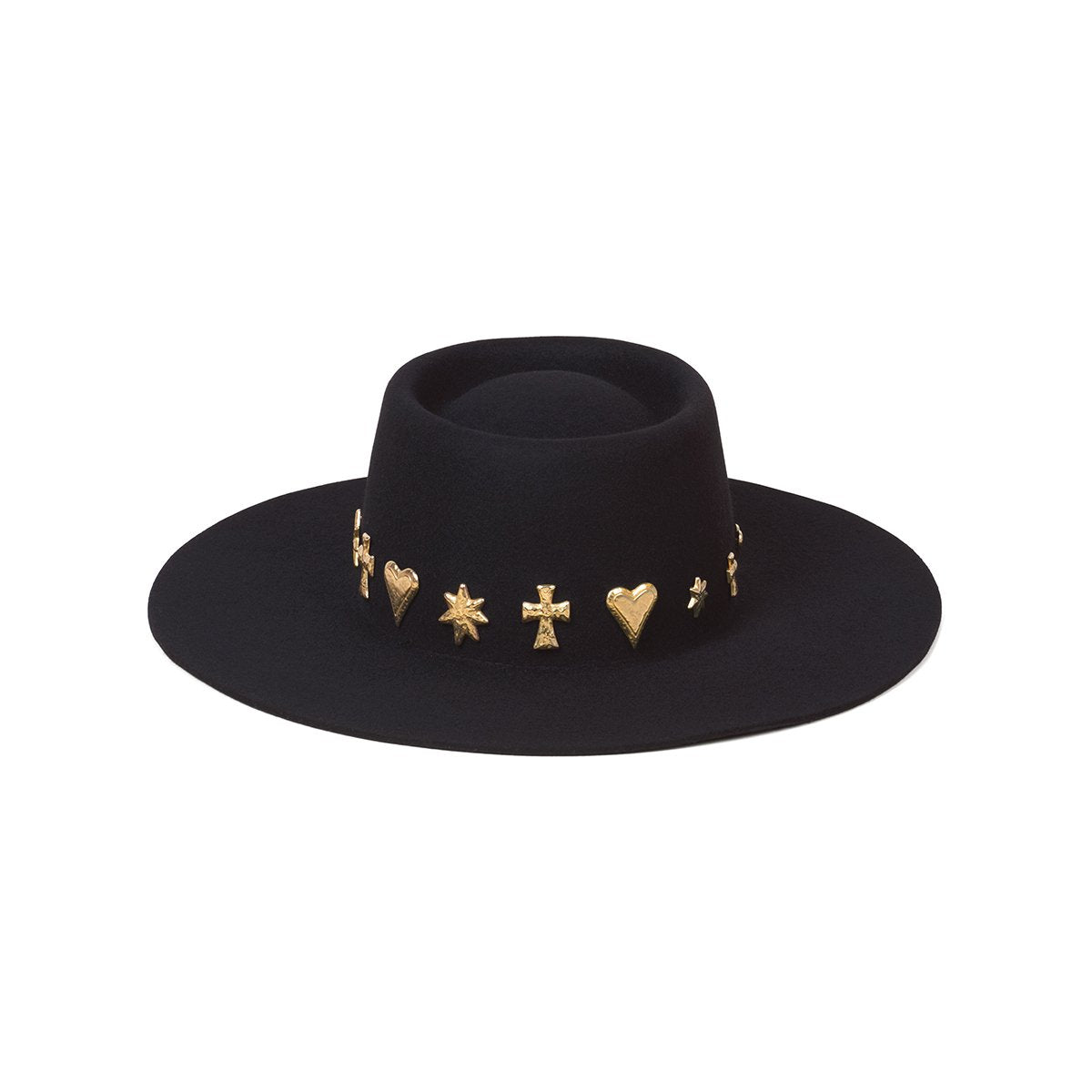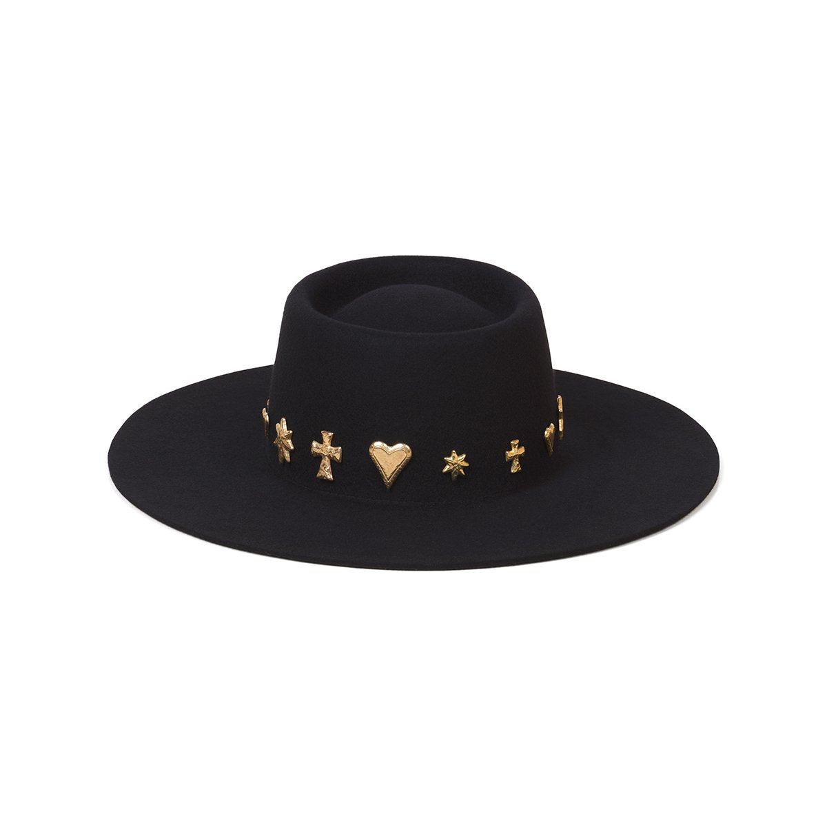 The chicest hat we have ever made. Classic black dipped boater silhouette with custom made gold LOC conchos. The Celestial Boater has serious wow factor - now made in a Kids version for your mini.