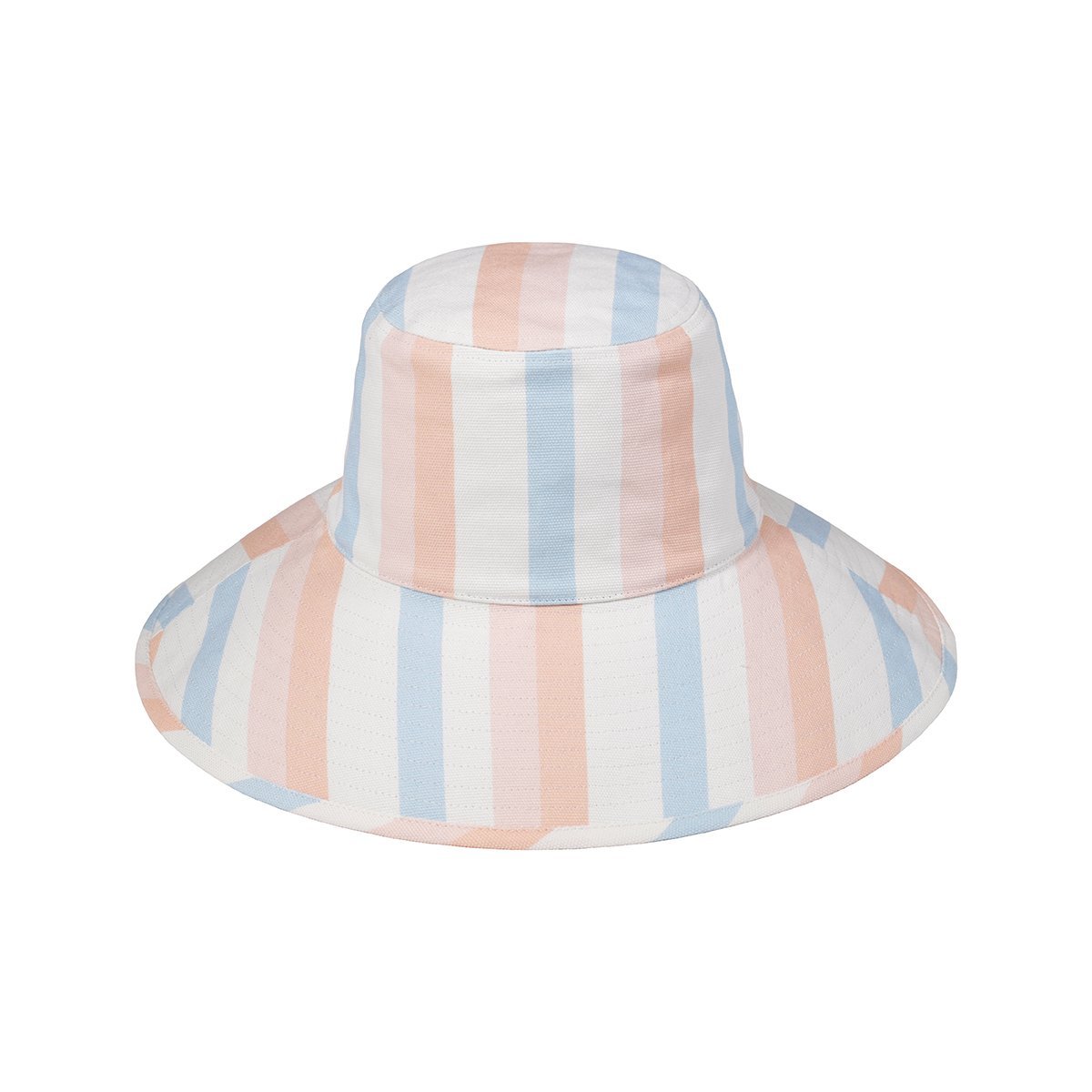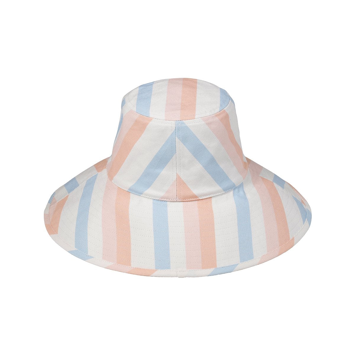- Wide-Brimmed bucket hat design in Pastel Peach, Pink, Blue & White Candy Stripe