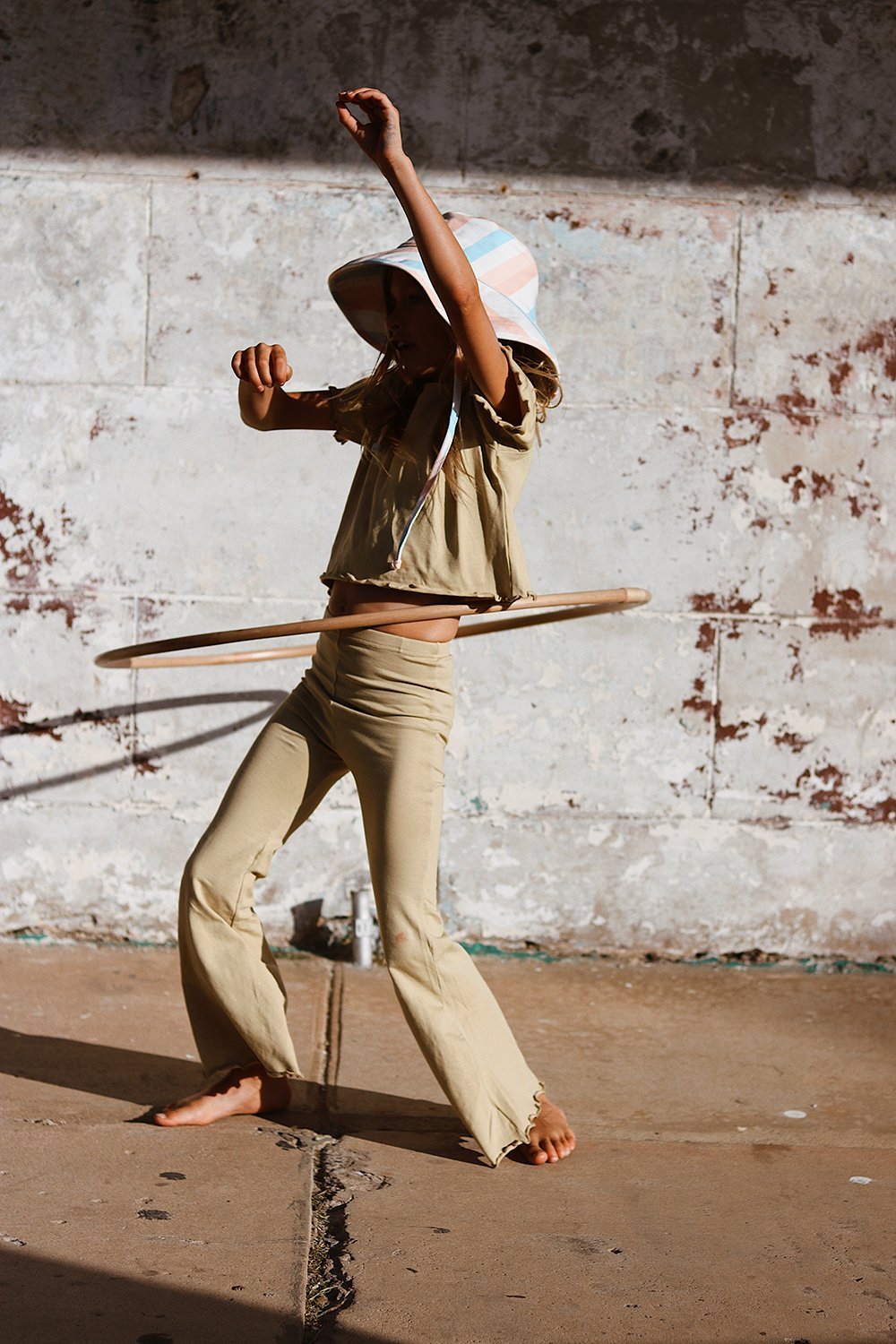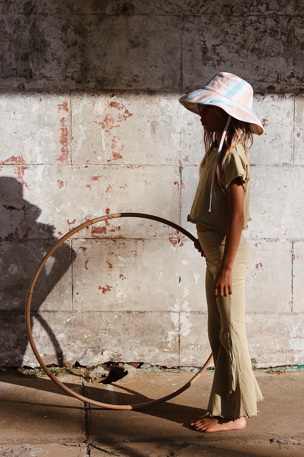 Now available in mini... Introducing our new wide brimmed holiday buckets. Made from 100% cotton canvas, with custom pastel candy stripe print. Finished with neck tie to secure hat to your head on all the adventures your day may bring you.