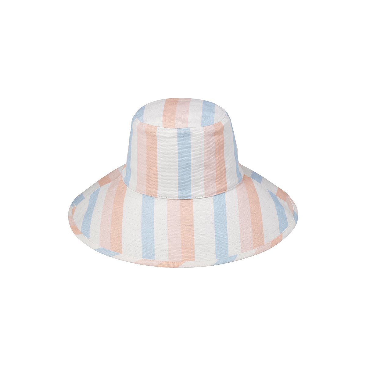 - Wide-Brimmed bucket hat design in Pastel Peach, Pink, Blue & White Candy Stripe
