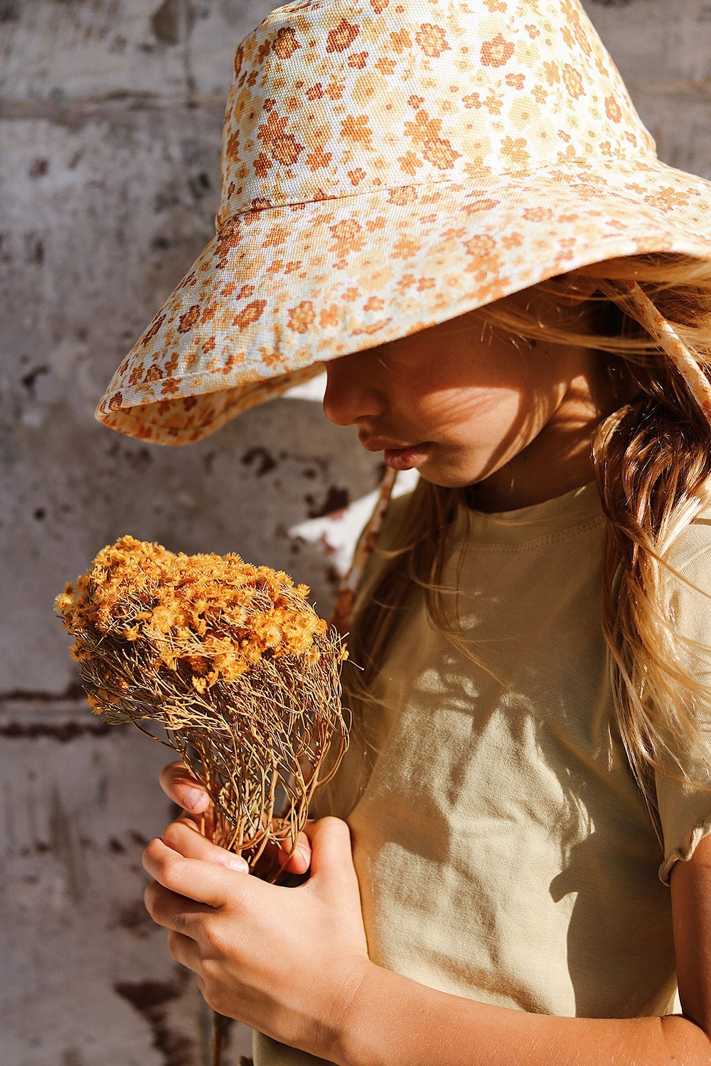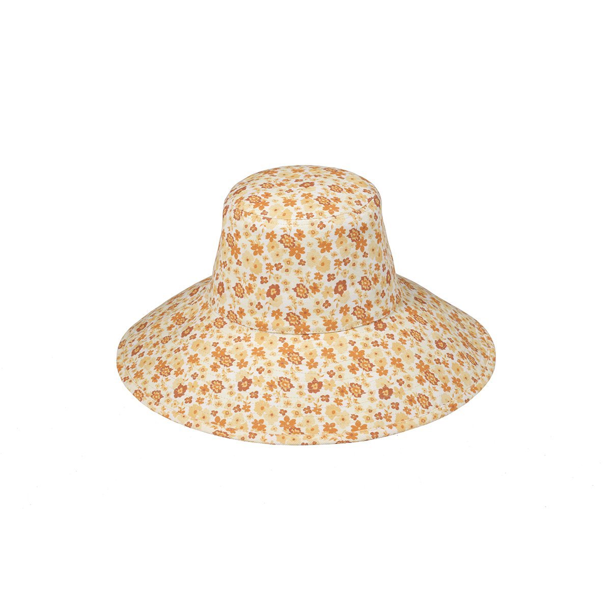 Now available in mini... Introducing our new wide brimmed holiday buckets. Made from 100% cotton canvas, with custom peach & yellow retro floral print. Finished with neck tie to secure hat to your head on all the adventures your day may bring you.