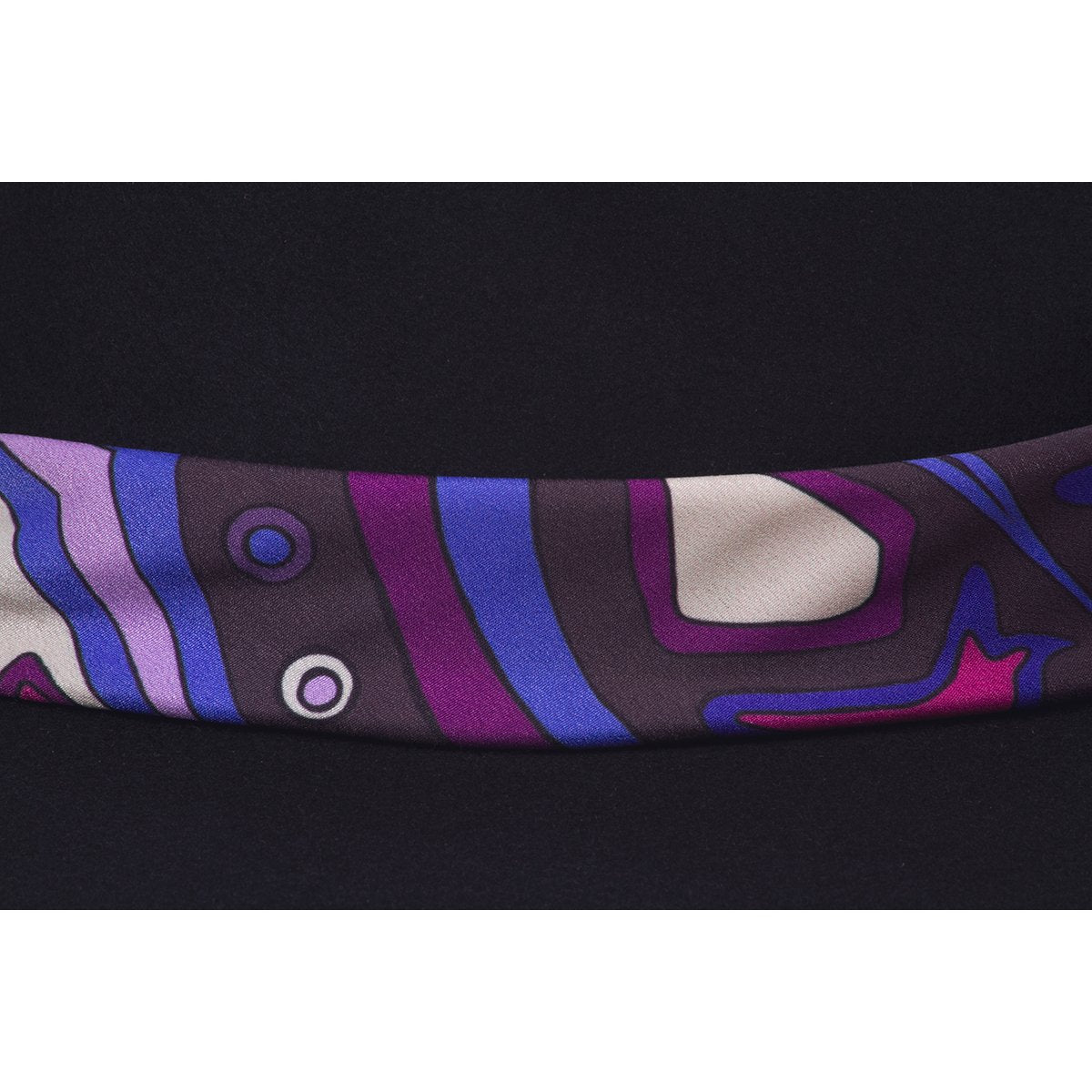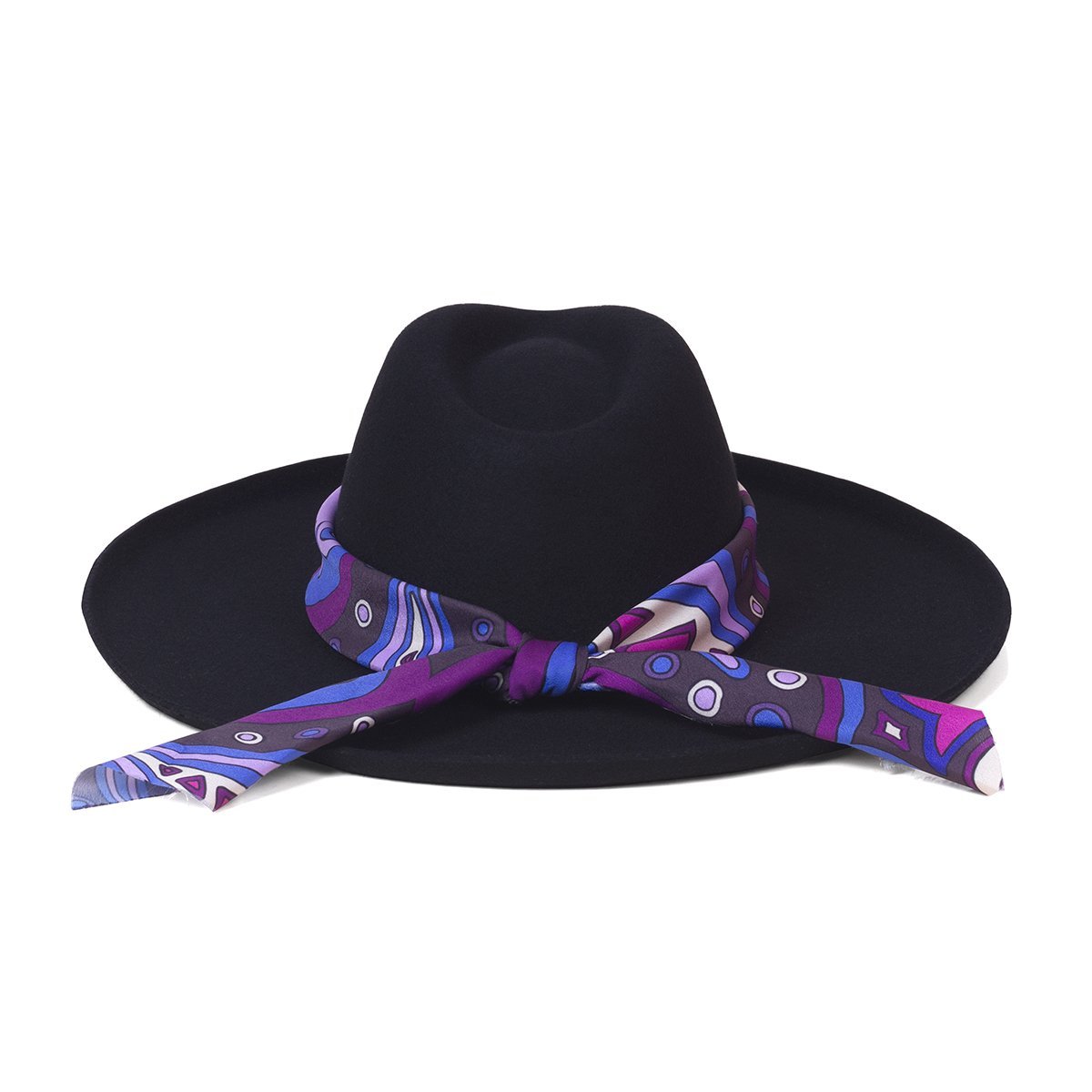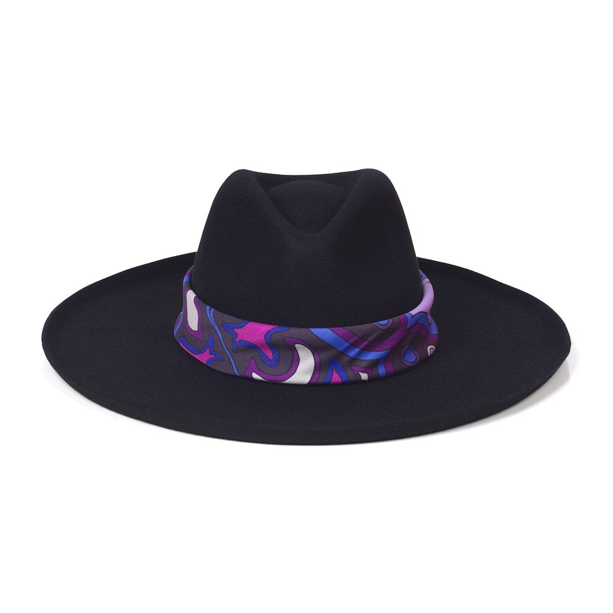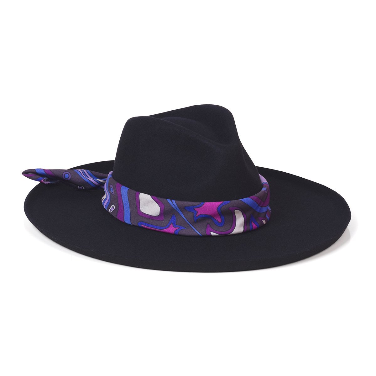 A classic wide brimmed, firm fitting fedora silhouette with flicked edge. Trimmed with detachable custom print vintage inspired scarf.