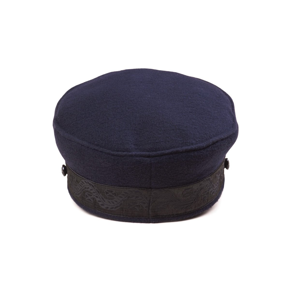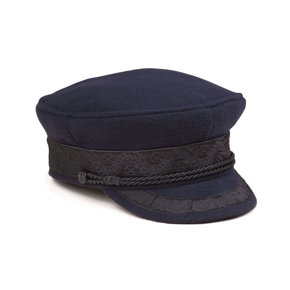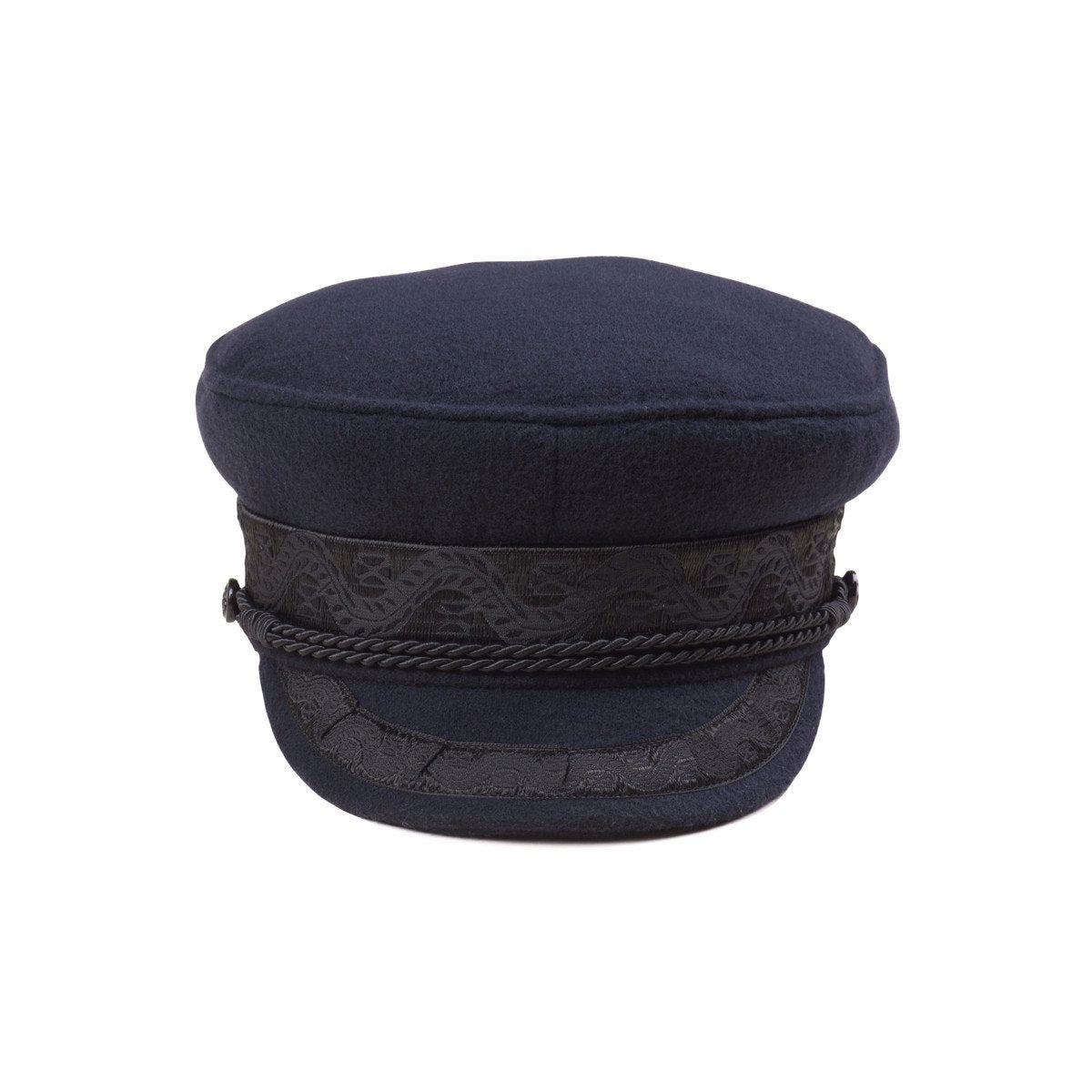 The Riviera Cap is a chic, vintage inspired sailor cap that can be paired with any outfit to make a statement. Trimmed with sailor button details, braided rope and vintage Gonzo ribbon.